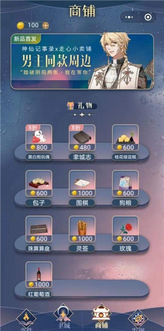 还嫌羁绊值加得不够?点击“商铺”,用做任务得到的【金币】购买礼物,送给心仪的男主即可。不同的礼物增加的羁绊值不同,要把礼物送给珍惜它的人哦。每天都刷新特价礼物,如果是懂得的人,可以在特价时购入大批礼物,最大化利用金币~