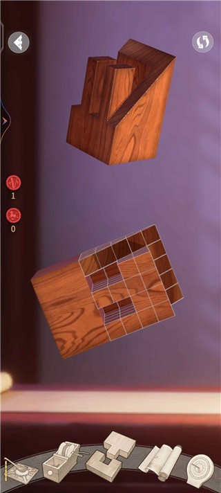 3.以第一个关卡为例,画面中“榫”结构与“卯”结构分别将位于屏幕的上下两端,只需点击屏幕上方的物件,二者将会进行切换,在空白处滑动手指则能旋转位于屏幕中间的物件。