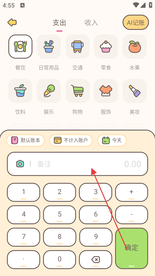 3、于编辑界面,挑选支出或者收入类型,填入金额,增添备注后点击【确定】,便能记录此笔账目。