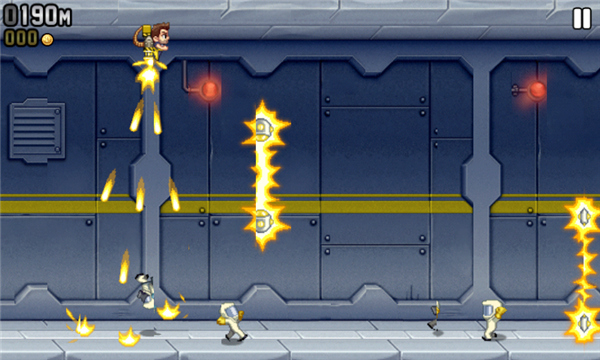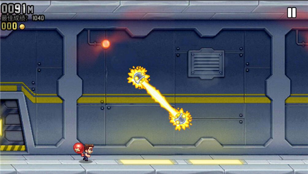【操作技巧】:长按一下屏幕,让Barry飞到画面的中间位置,即上面空余的地方和下面空余的地方相同。然后每隔0.5秒触摸一下屏幕,保持Barry不会下降,一直处于画面的中部。如果中部出现电火链,应根据其他电火链或导弹的位置,迅速把Barry调整到画面的上部或下部,待中部的电火链消失后再回归中部。