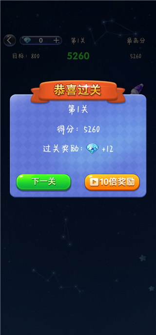 4、轻轻松松我们就能通过第一关,游戏结束后能看到本次分数和奖励;