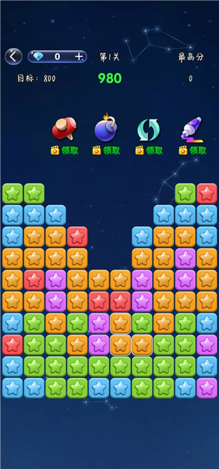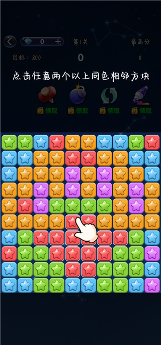 休闲点消玩法,只要点击相邻的同色星星即可消除得分,操作简单好上手,是轻松益智小游戏的首选。