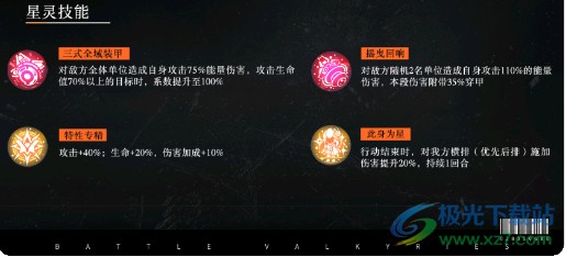 三式全域装甲:对敌方全体单位造成自身攻击75%能量伤害,攻击生命值70%以上的日标时,系数提升至100%。