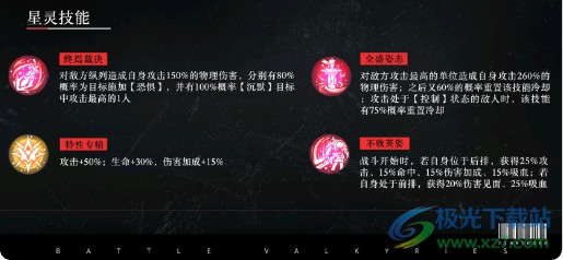 全盛资态:对敌方攻击最高的单位造成自身攻击260%的物理伤害,之后又60%的概率重置该技能冷却,攻击处于控制状态的敌人时,该技能有75%概率重置冷却。