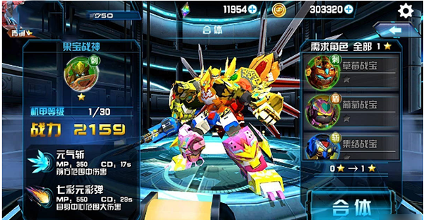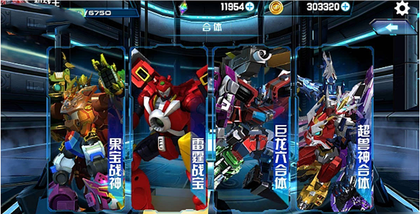 现在游戏中提供的合体机甲共有4款,分别是来自《果宝特攻》世界的果宝战神、《快乐酷宝》世界的雷霆战宝、《钢铁飞龙》世界的巨龙六合体、《超兽武装》世界的超兽神合体。