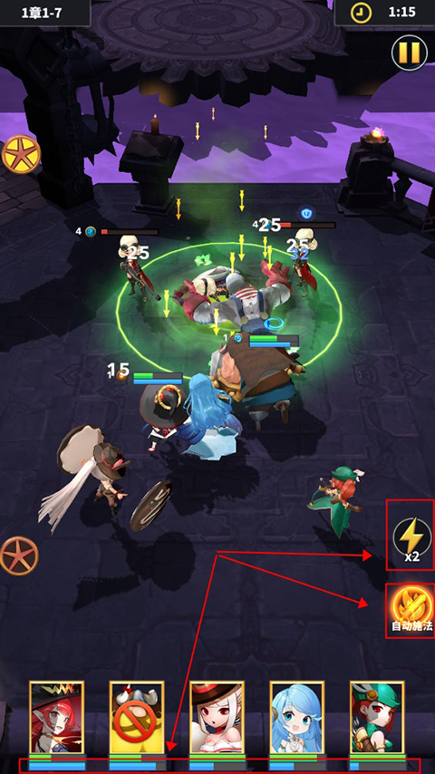 4、进入关卡后,英雄会自动开始战斗,玩家可以打开倍速开关及自动施法,解放双手,加快游戏节奏,英雄通过战斗可以积攒能量,满后即可释放技能。