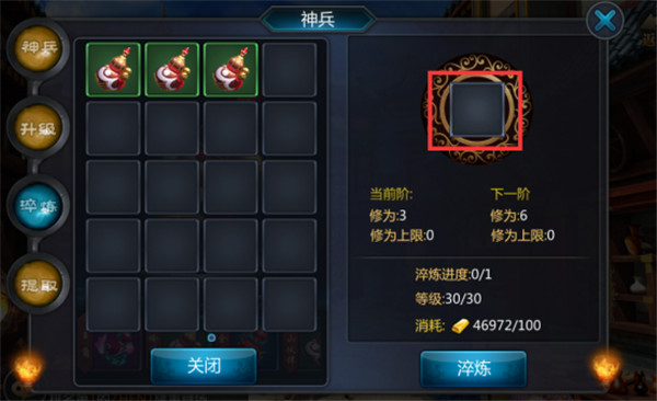 4、神兵淬炼:神兵淬炼的存在主要为神兵升级服务。神兵每升30级,需要淬炼后,才能继续升级。因此当神兵升到30级无法再继续升级时,小伙伴们就要开始准备神兵淬炼了。