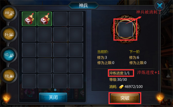 淬炼神兵的品质越高,对应被消耗的神兵也要求越高