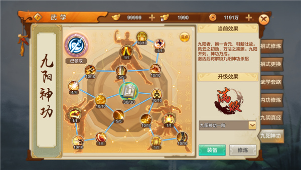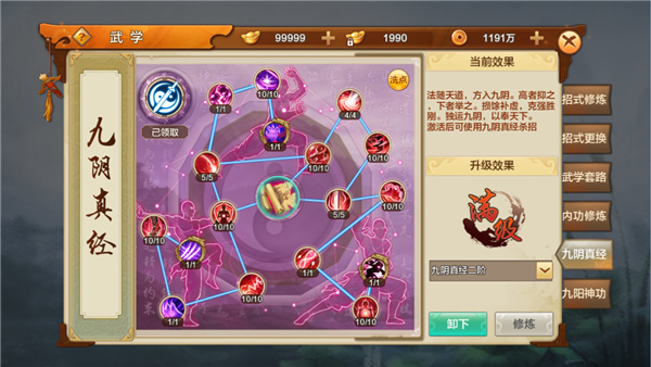 1、系统开启后通过主界面右侧菜单【武学】-【九阴真经】/【九阳真经】进入;