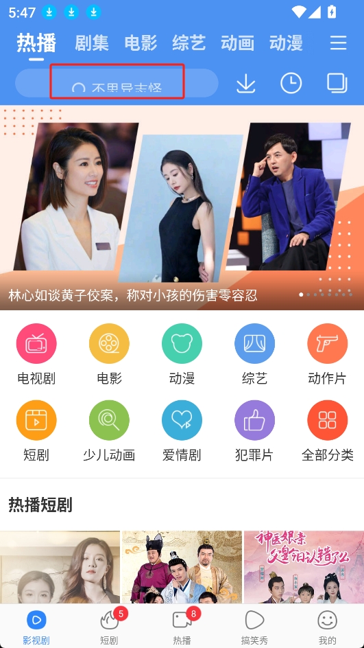 1.打开软件,在软件主页搜索框搜索想要看的视频,如图所示;