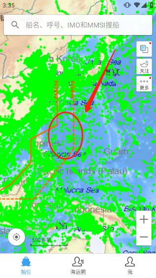 2、放大到一定程度后,在地图上就可以看到当前海域上的船舶了。