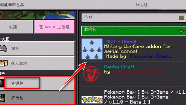 6、接下来返回游戏创建世界,在“资源包”中即可选择刚才下载到的mod模组了