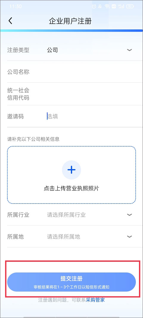 6、选择注册类型,输入公司名称、统一社会信用代码,选填邀请码,点击提交注册。