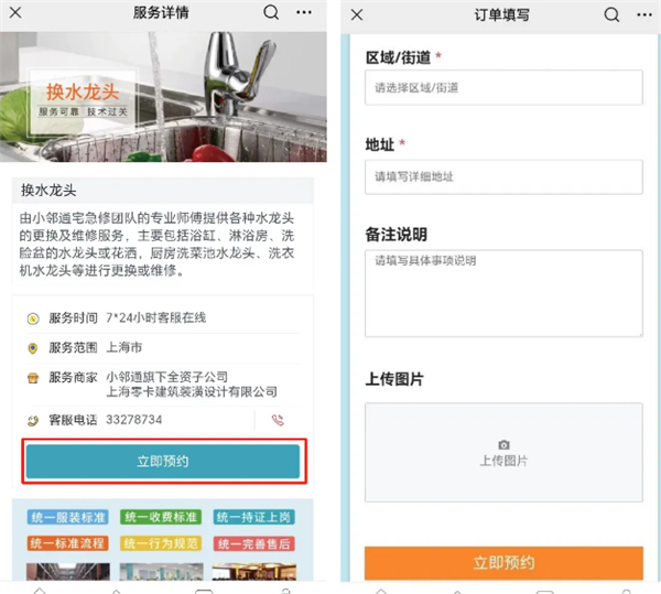 2、在服务详情页,点击“立即预约”,填写订单详细信息。