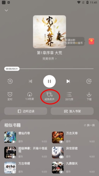 6、即可开始听书,点击图示位置可切换阅读声音。