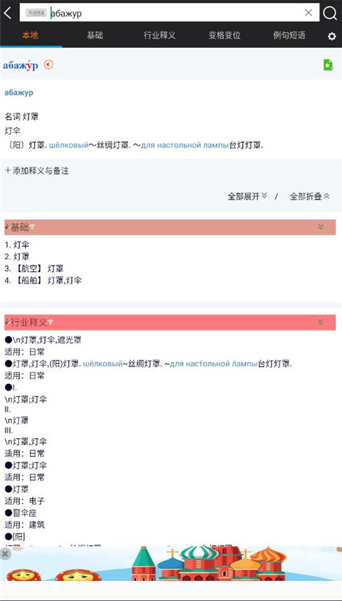 3、支援俄汉双向基本释义、行业释义、例句、重音、变形变格资料查询等功能。